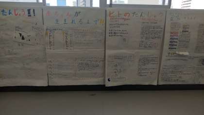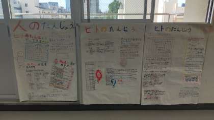 理科(ヒトの誕生)グループで調べたことを発表しました。新しいことを知れたり、友だちの発表の仕方のよさも知ったりすることができました。発表が終わって廊下に掲示しています。