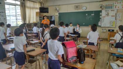 朝の会の始まりは、学級の歌から始まります。「ありがとうの花」の替え歌で「2の1の花が咲くよ」と振りをつけて歌っています。