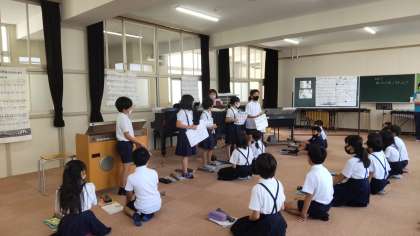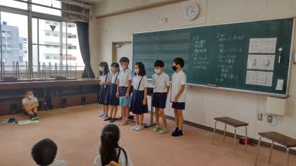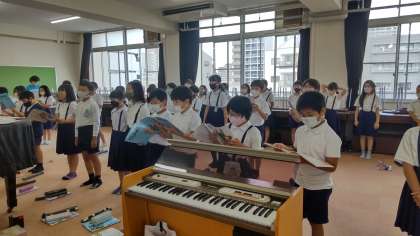 音楽(ゆかいに歩けば)最初に早口言葉や体を動かして体ほぐしをしたあと、「ゆかいに歩けば」の合唱をするのに前時に歌った録音を聞いて、それぞれ課題を見つけました。その後、アルト、ソプラノのグループに分かれて練習をしました。特に気をつけて練習したところをアカペラで発表し、最後に全員で歌いました。次は、もっとお互いの声を聞き合って二部合唱を仕上げていきます。
