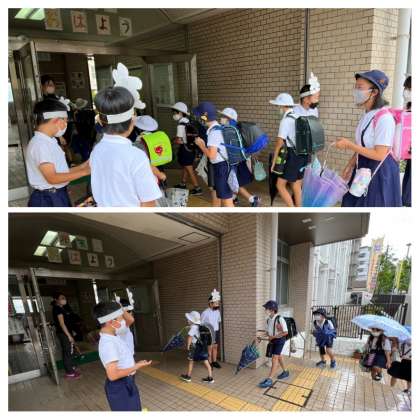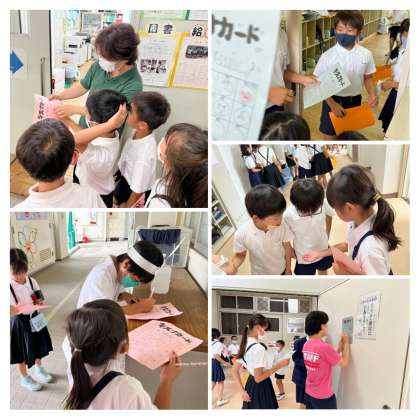 あいさつ運動が昨日から始まっています。今回のスローガンは、「あいさつで絆を深めろ!めざせパーフェクト!」です。あいにくの雨でのスタートでしたが、キズナちゃんを被った児童会のメンバーがみんなをお出迎え、みんなからもあいさつがたくさん返ってきました。教室や廊下でもあいさつの声が聞こえ、挨拶した人にきずなカードにサインをしてもらいました。休み時間も各学年の教室を訪れてあいさつをしていました。その成果か今朝廊下に響くあいさつの声がいつもより元気です。夏休みまであいさつの輪を学校中に広げ、みんながもっともっと仲よくなりますように!