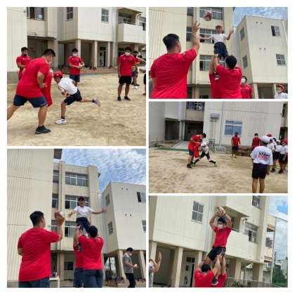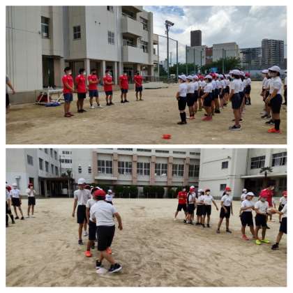 今日は夢授業で、NTTドコモハリケーンズの選手の方が6人来てくださいました。ゲームをしながら、ラグビーボールに親しみました。最後にプロラグビー選手のスクリューパスやタックルバックにボールを持ってぶつかるあたりの練習も見せてもらいました。スクリューパスは、30m位子どもたちの上を投げてもらって子どもたちからは「おおっ」と声が上がってました。ラインアウトのときにするリフトもしてもらいました。暑い中でしたがあっという間の45分でした。
