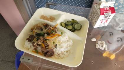 今日の給食は、牛丼、大福豆の煮物、きゅうりのしょうがづけでした。写真のお皿の横にあるのは、大福豆の乾燥したものです。みんな調理したものと見比べていました。