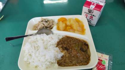 夏野菜のキーマカレー、ゴーヤとツナのマヨネーズ風味、ミックスフルーツ(缶)昨年度の大阪市の献立コンテスト優秀賞の献立です。