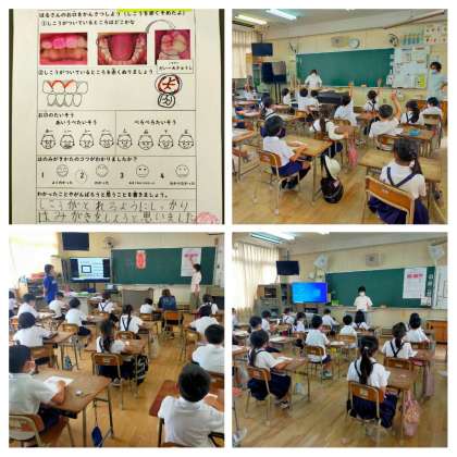 今日は、歯科衛生士の方と歯科校医の岡山先生に来ていただき、2年生を対象に歯みがき指導を行いました。奥歯の永久歯「第一大臼歯」は、1番大きくて、1番噛む力が強く、1番虫歯になりやすいことがわかりました。また奥歯や前歯は歯ブラシを縦や横にして工夫しようというお話と、お口の体操の「あいうべたいそう」も教えてもらいました。おうちでも、鏡を見ながらていねいに歯みがきをしましょう!