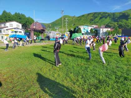 おはようございます。今日はとてもいい天気です。朝の集いです。中野っ子体操で目を覚ましましょう。みんな元気です。