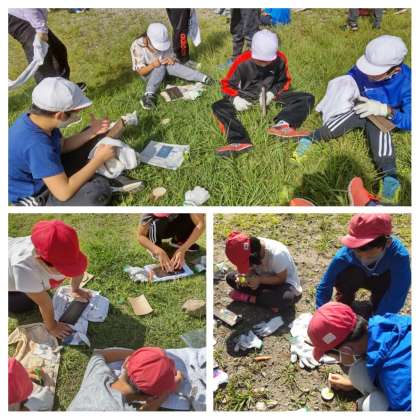 キーホルダーを磨いて、焼板のすす落としから始めました。ブラシで磨くとすすが風で飛んでいくのが見えました。そして、古タオルでさらに磨きをかけました。磨いた板に思い思いに絵や言葉をペイントでかきました。乾いてから学校に送ってくださるそうです。