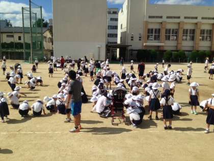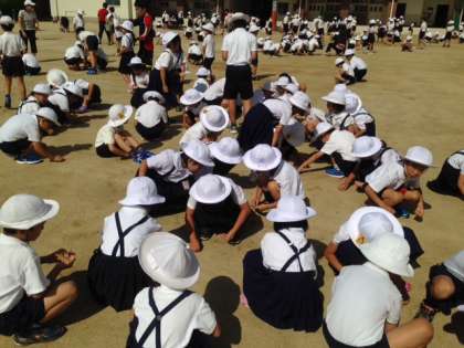 1学期の初めに交通安全の話をしましたね、覚えてますか。車は急には止まれない。あっ!と気がついてブレーキを踏んでも30mくらい走らないと止まらないという話です。みなさんが交通安全に気をつけているから今まで大きな交通事故は起きていません。きちんと守れている事は素晴らしいです。でも、昨年度、平成26年の子どもに関する交通事故の件数では大阪府が全国でワースト1、一番悪かったんですよ。それで、事故にならないようにちょっと注意してほしい事があります。
