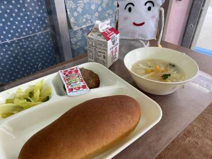 今日の給食は、焼きハンバーグ、豆乳スープ、キャベツとピーマンのカレーソテーです。