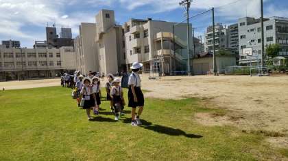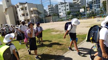 2学期はじめに、大雨の時に集団下校できるように避難訓練を兼ねて地域子ども会をしました。班揃ってほとんど来れていますが遅れて登校している人もいます。それぞれの家に近い門から分かれて集団下校しました。