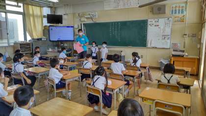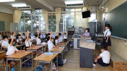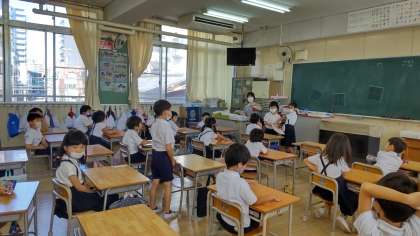 月曜日の朝、Teamsでの児童朝会のあと、各クラスでは朝の会が行われます。1年生の教室です。日直さんが司会をして昨日のことをスピーチしています。友だちが質問してくれて指名するのがみんな大好きです。