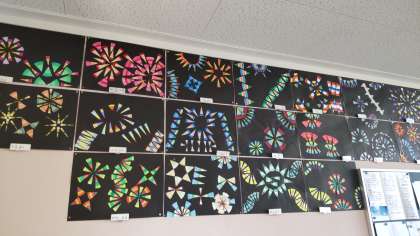 円に絵の具で模様を描きいろいろな大きさのおうぎ形に切って思い思いの形に貼りました。夜空に上がる花火のような作品もありますね。