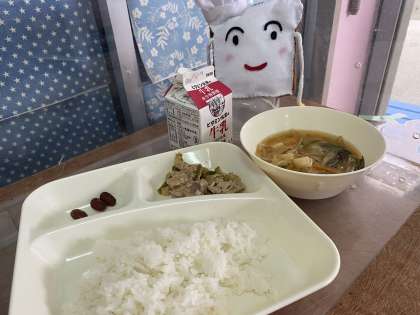今日の給食は、豚肉の甘辛焼き、みそ汁、金時豆の煮ものです。