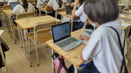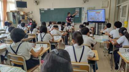 総合的な学習の時間、外国語です。広島修学旅行について調べたり、運動会のスローガンを決めるのに調べたりしました。外国語は、大型テレビに映し出される景色について森、池、川など学習しました。