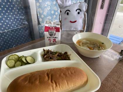 今日の給食は、牛肉のデミグラスソース煮、スープ、きゅうりのピクルスです。