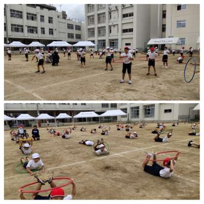 2年生は、輪を使った演技です。フラフープや前跳び等いろいろな技をお楽しみに。