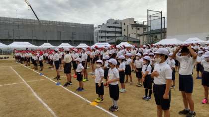今日は閉会式のリハーサルでした。整理体操の後の結果発表と司会の人のはきはきとした進行で行われました。その後、応援ダンスやたてわり競技の確認をしました。運動会はいよいよ明後日です。