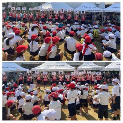 たてわり競技です。旗を班で回して旗の文字を並び替えて文字を作りました。暗号を解いて無事に校長先生も教頭先生も助けることができました。