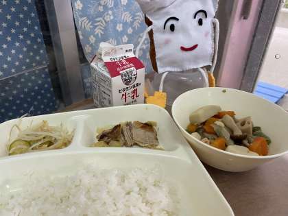 今日の給食は、豚肉のねぎのじょうゆ焼き、ふきよせ煮、きゅうりともやしの甘酢あえです。