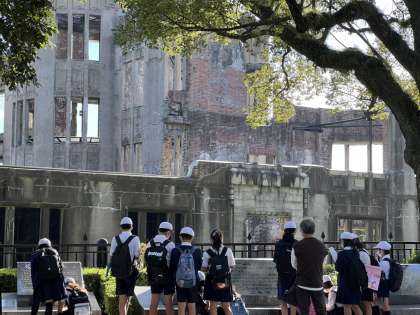 平和記念資料館でしっかり学習した後、公園内、本川小学校、袋町小学校等を活動班で地図を見ながら協力してフィールドワークしました。高校生、中学生、小学生、一般の方とたくさんの方が平和記念公園に訪れていました。
