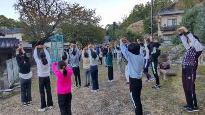 2日目の朝。いい天気です。朝の集い、民家の方に迷惑かけないようにストレッチをしました。みんな元気です。
