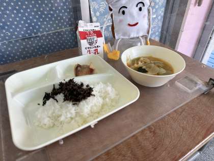 今日の給食は、あかうおのみずれかけ、みそ汁、牛ひじきそぼろです。