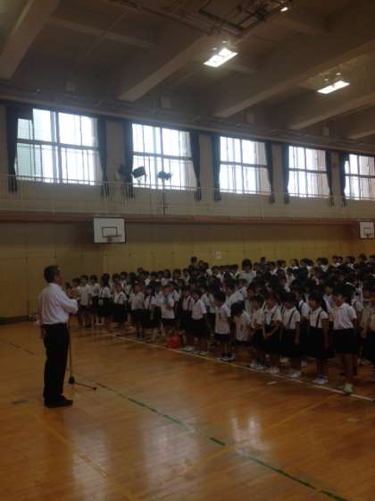 大阪市の暴風警報が解除され、予定通り、1学期終業式ができました。たくさん雨が降る中、みんながんばって登校できたね。