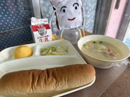 今日の給食は、豆乳コーンクリーンシチュー、はくさいのピクルス、かきです。
