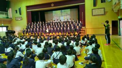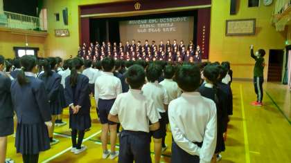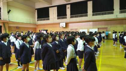 修学旅行で訪れた広島で学んできたことを全校に伝える報告会を昨日行いました。みんなで折った鶴のパネルを奉納したことを報告し、平和記念資料館や公園内近辺のフィールドワークや夜に原爆について講演していただいて、感じたことを書き記した中からみんなに伝えることを言葉にして呼びかけました。相手を理解すること、受け入れることが大切だと伝えました。また、全校で「この時代に生きて」を歌いました。講堂に平和を願う歌声が響き渡りました。被爆アオギリの2世の苗木をもらってきたので、原爆にも負けずに命を繋いだアオギリのように私たちも命を大切にしていけるよう校庭に植樹する予定です。