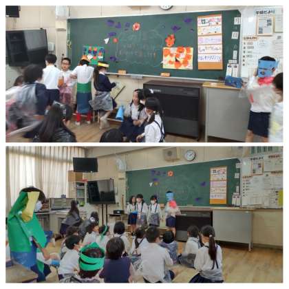 2年1組では、学級会で話し合ってみんなで仮装をしてハロウィンパーティーをしました。宝探しにカード交換です。宝探しでは、教室に折り紙で作ったカボチャなどを隠してみんなで見つけました。カードには友達の素敵なところを書いてプレゼントしました。休み時間に司会やはじめ・おわりのことばを自分たちで考えて練習してやりました。パーティーを成功させようと自分の役割を頑張る子どもたちです。