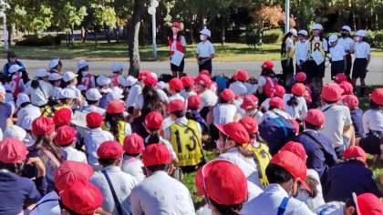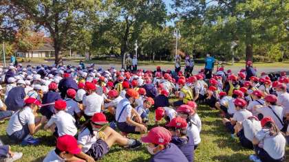 スタート式の様子です。児童会の子どもたち頑張ってます!今年のスローガンは「ありったけの夢で新時代へ出港だ!!ニコニコの実できずな王になる!!in鶴見緑地」です。