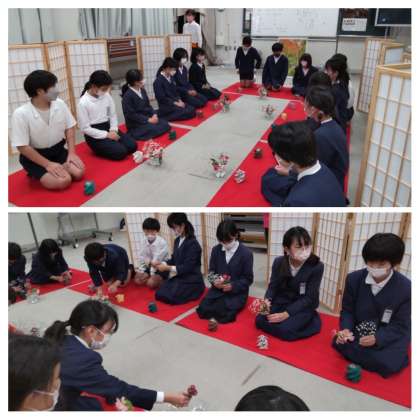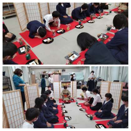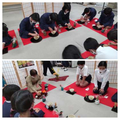 一昨日3年ぶりにクラブでお茶をいただきました。多目的室に毛氈を敷き、衝立を立ててお茶室に見立てて行いました。入り方、座り方、を教えてもらい、自分のためにまず花をいけました。その後、中野小学校のために特別に作ってくださったお菓子をいただいて、自分でお茶を立てて飲みました。少し苦味があり、苦手な子もいましたが、緊張しながらもみんなでお茶を楽しむことができました。当日、お手伝いくださった保護者の皆様ありがとうございました。
