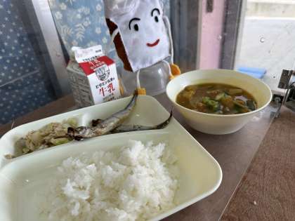 今日の給食は、焼きししゃも、和風カレー汁、まいたけときゃべつのいためものです。