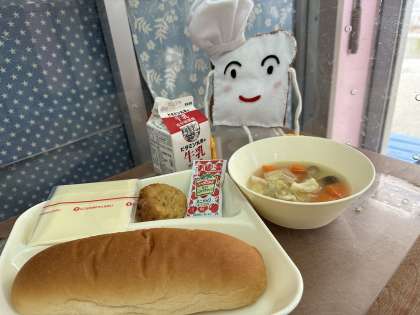 今日の給食は、とうふハンバーグ、カリフラワーのスープ煮、スライスチーズです。