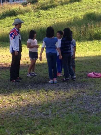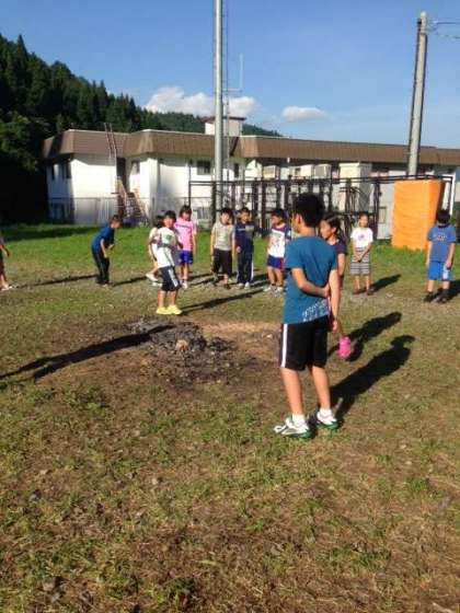 まだ明るくて、火もついていないキャンプファイヤー。そうです。レク係さんが、キャンプファイヤーのスタンツの練習をしているのです。ちょっぴり恥ずかしがりの五年生・・・。燃えろよ、燃えろ! 絶対大丈夫。