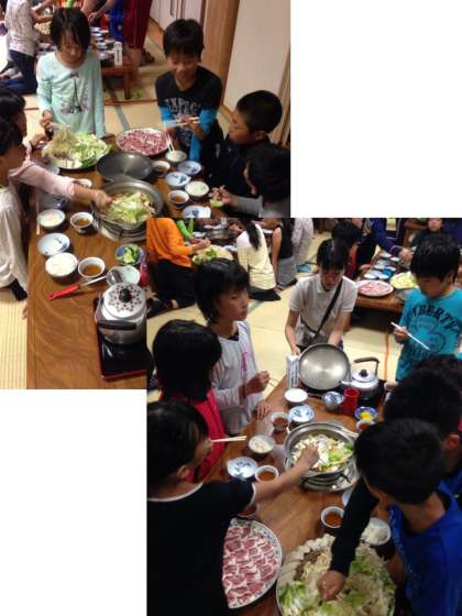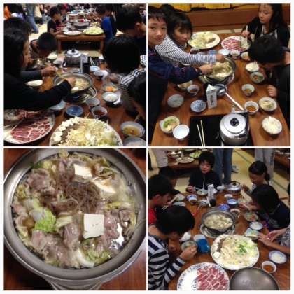 夕食は珍しい鴨鍋ですよ。おいしい〜*\(^o^)/* ハチ北高原の名物です。おいしいお鍋にご飯も進みます。4杯も5杯もおかわりしている人がいましたよ。ごちそうさま〜!!