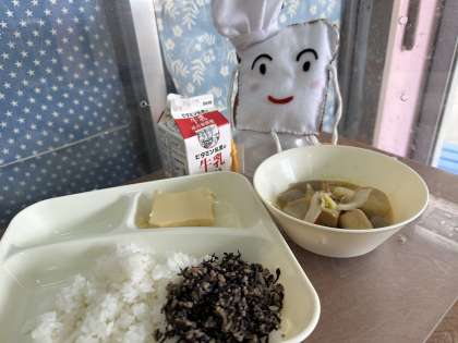 今日の給食は、卵どうふ、一口がんもと野菜の煮もの、魚ひじきそぼろです。