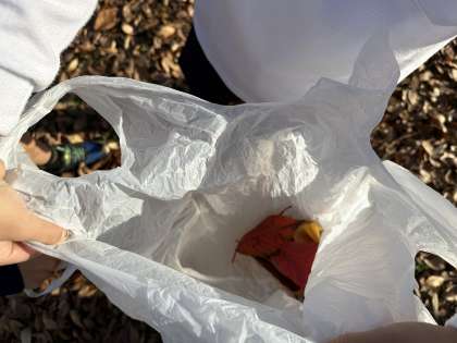 きれいな葉っぱを見つけて、袋の中に入れて、たくさん持って帰りました。
