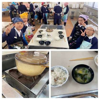 この間計画した調理実習をしました。みそ汁とごはんです。みそ汁は煮干しでだしを取って、具はわかめとネギと2年生が育てたさつまいもでした。田んぼで育てて収穫した中野米を使ってお鍋でご飯を炊きました。透明の鍋なので炊ける様子がよく分かりました。私もいただきましたがとても美味しくできてました。