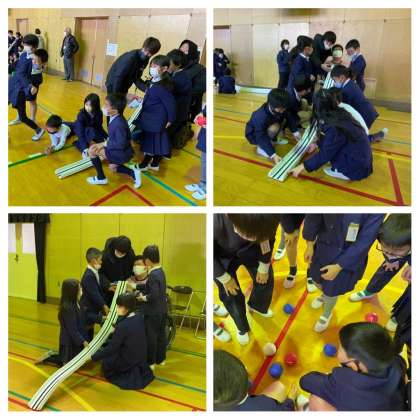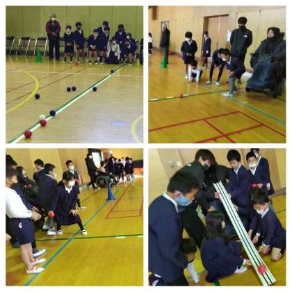 今日は地域にある自立生活センター「あるる」さんの方と社会福祉協議会の方と地域の方が来てくださってボッチャ体験をしました。国語で学習したボッチャですが初めて経験する子がほとんどでした。あるるの方にルール説明を聞いて4つのコートに別れてあるるさんから来ていただいた方と交流しながら赤チームと青チームに別れて対戦しました。あるるさんの中には投げれないのでスロープを使ってゲームをする方がいます。子どもたちはみんなでスロープを持ってサポートしていました。投げ方も買いを重ねると上手になって白いボールにぴったりつける人もいました。どっちが白に近いか調べている写真もあります。勝ったり負けたり一喜一憂してとても楽しかったようです。