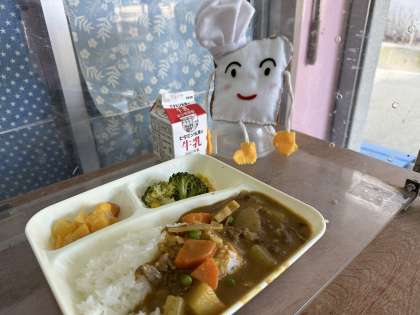 今日の給食は、冬野菜のカレーライス、ブロッコリーとコーンのサラダ、黄桃(かんづめ)です。