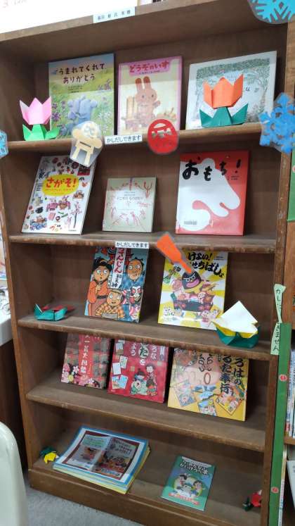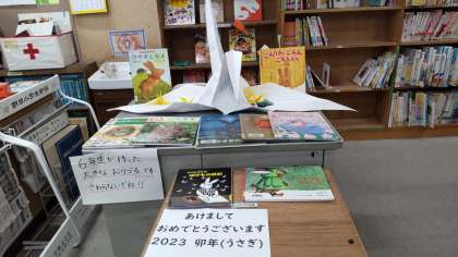 学校図書館では、うさぎ年にちなんでうさぎに関係する本を展示しています。また、お正月に関係する本も棚に展示しています。