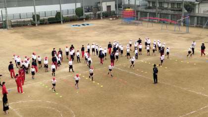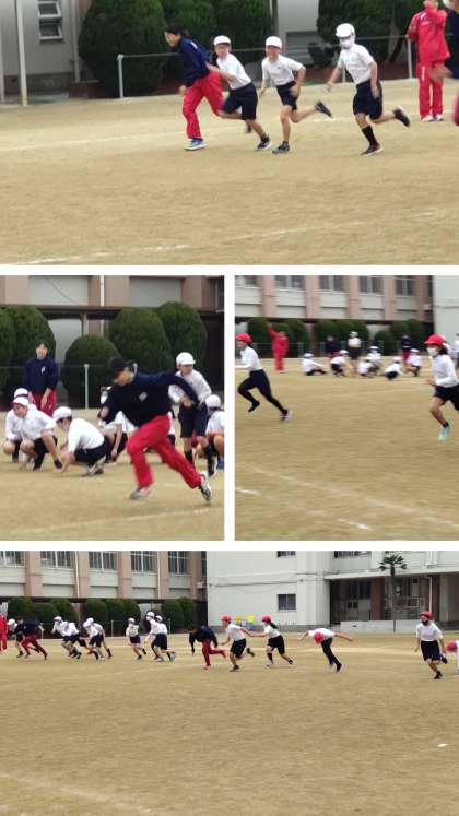 今日は、桜宮高校の陸上部の人たちが、短距離走の学習に来てくださいました。ストライドが大きくてどんどんスピードに乗って速く走る高校生のみなさんに子どもたちから「速っ」という声も聞かれました。高校生の人に必死でついていこうとがんばっている人もたくさんいました。短い時間でしたが、あんなふうに速く走りたいと思った人もたくさんいたのではないでしょうか?