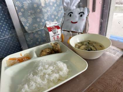 今日の給食は、さばのカレーたつたあげ、五目汁、紅白なますです。