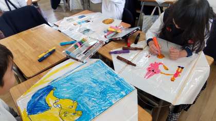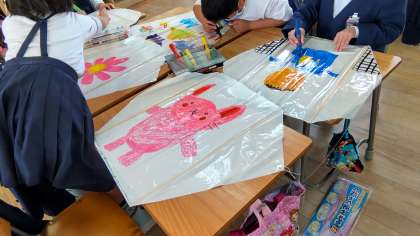 1年生は、生活科で昔遊びを学習しています。凧に好きな絵を描いているところです。また、みんなで凧あげをします。