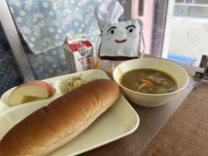 今日の給食は、ミートボールと野菜のカレー煮、ツナとキャベツのソテー、りんごです。