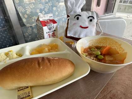 今日の給食は、豚肉と野菜のケチャップ煮、カリフラワーのピクルス、フルーツゼリーです。