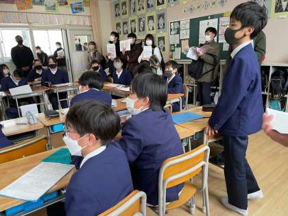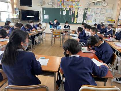 5年生は、「中野のバトンを受け取ろう〜リーダーになるために〜」という題材で話し合いました。中野小学校では、コロナ禍でもたてわり班活動をやめずに続けて取り組んできました。5年生は来年たてわり班のリーダーになります。また、委員会活動やクラブ活動でも委員長や部長として学校を引っ張っていきます。6年生になる前のこの時期にしっかり6年生を見て自分のすべきことを学んでほしいと思い、この題材で話し合いました。下学年に憧れられる6年生になるためにしっかり自分ごととして話し合うことができました。頼もしい限りです。写真は近くの人と話し合っているところです。
