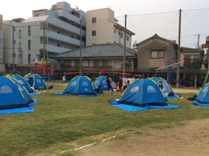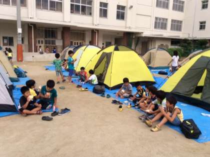 運動場でのテント泊、さわやかな朝を迎えました。みんな元気です!でも、睡眠数時間の子もいるのでは?