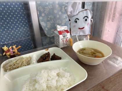 今日の給食は、くじらのオーロラ煮、まる天と野菜のうま煮、もうしのピリ辛あえです。