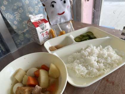 今日の給食は、関東煮、きゅうりの梅風味、白花豆の煮ものです。